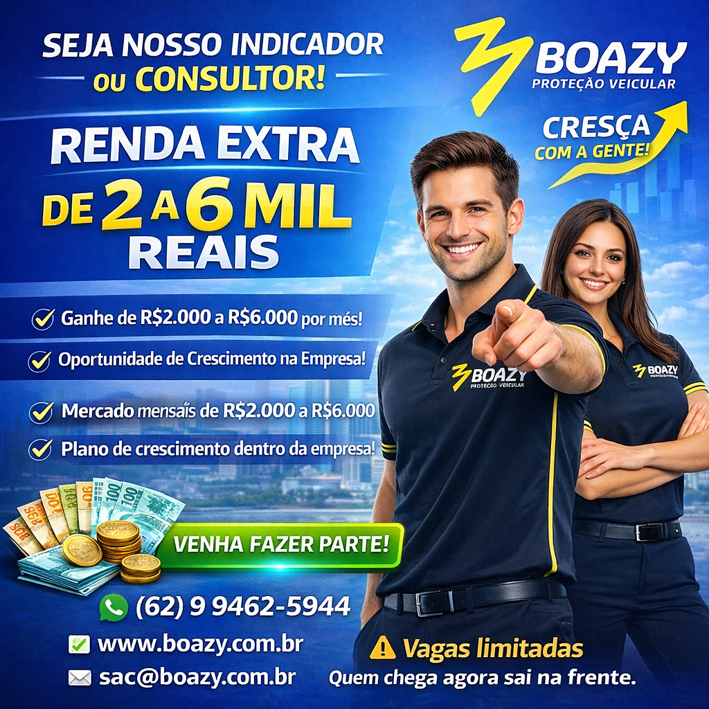 A BOAZY oferece uma excelente oportunidade de renda extra através da PROTEÇÃO VEICULAR. Com um mercado em plena expansão, você pode alcançar ganhos significativos ao se tornar um INDICADOR e, posteriormente, um CONSULTOR BOAZY. O modelo de trabalho é simples e transparente, garantindo total suporte para sua trajetória. Não perca a chance de se inscrever e transformar sua vida financeira!