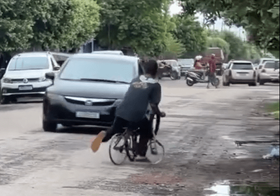 O folclórico Rafaeizinho voltou a ser assunto nas ruas e redes sociais de Goianésia nesta semana. O personagem conhecido pela cidade foi flagrado pedalando uma “bicicletinha” apenas no friso da roda, sem pneu, em um vídeo registrado por Gui062-Oficial.