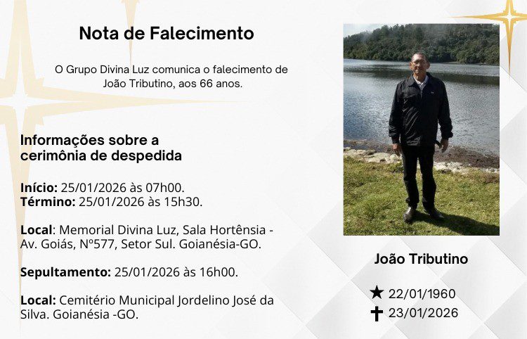 O velório de João Tributino será realizado no Memorial Divina Luz, Sala Hortênsia, localizado na Av. Goiás, Nº 577, Setor Sul, Goianésia – GO, com início às 07h00 e término às 15h30 do dia 25/01/2026. O sepultamento está marcado para as 16h00 do mesmo dia, no Cemitério Municipal Jordelino José da Silva, em Goianésia.