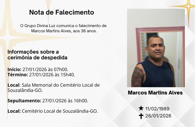 O velório de Marcos Martins Alves será realizado na Sala Memorial do Cemitério Local de Souzalândia – GO, com início às 07h00 e término às 15h40 do dia 27/01/2026. O sepultamento está marcado para as 16h00 do mesmo dia, no Cemitério Local de Souzalândia – GO.