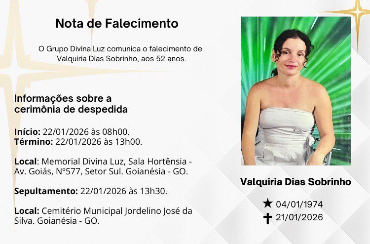 O velório de Valquiria Dias Sobrinho será realizado no Memorial Divina Luz, Sala Hortênsia, localizado na Av. Goiás, Nº 577, Setor Sul, Goianésia – GO, com início às 08h00 e término às 13h00 do dia 22/01/2026. O sepultamento está marcado para as 13h30 do mesmo dia, no Cemitério Municipal Jordelino José da Silva, em Goianésia.