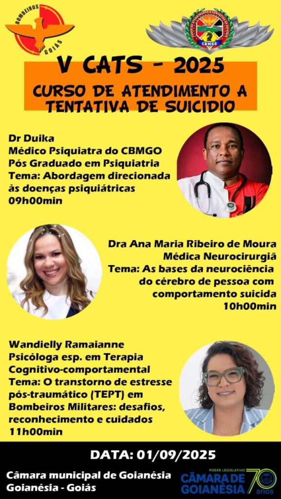 O Corpo de Bombeiros Militar do Estado de Goiás, com apoio do 18º Batalhão de Bombeiros Militar, promoverá em Goianésia o Curso de Atendimento a Tentativa de Suicídio (CATS). A capacitação visa preparar bombeiros para abordagens técnicas e táticas, incentivando a desistência de pessoas em situações de risco por meio de procedimentos positivos.