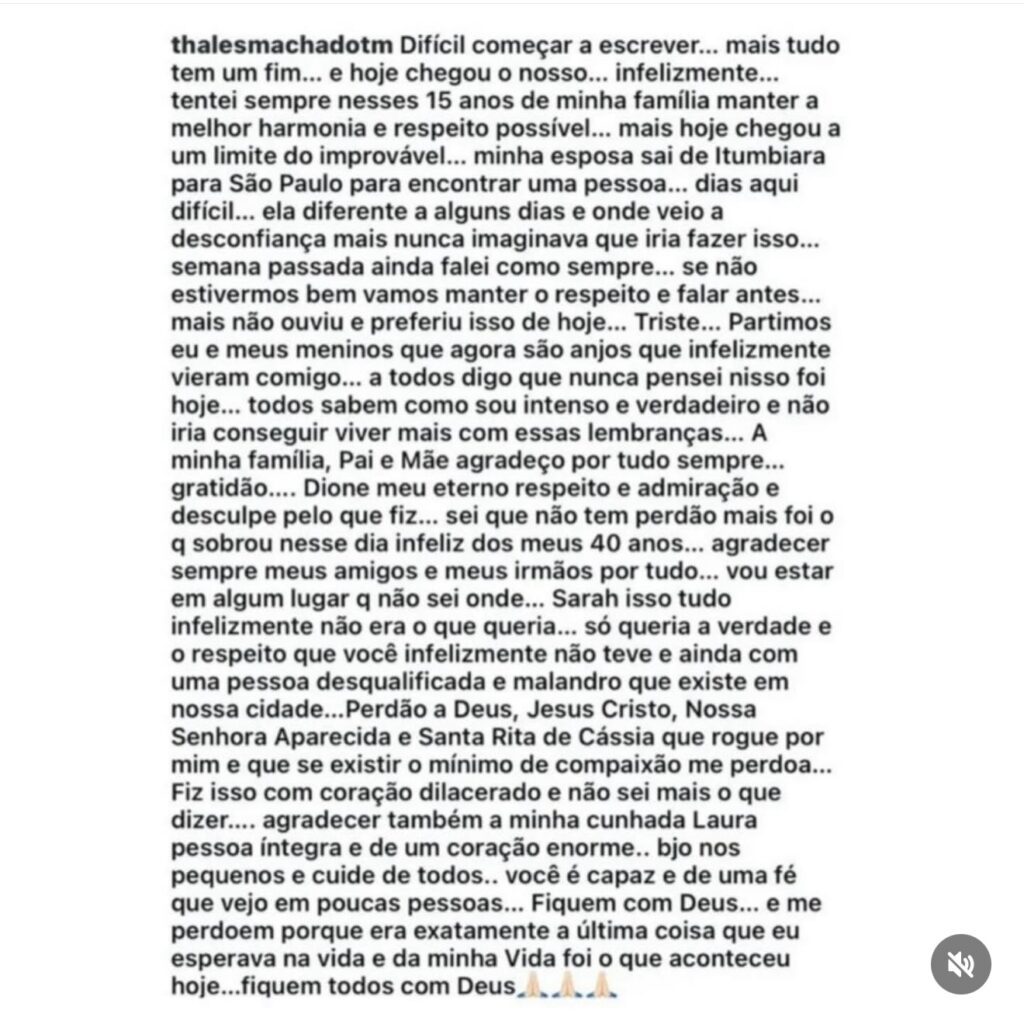 thalesmachadotm Difícil começar a escrever … mais tudo tem um fim … e hoje chegou o nosso … infelizmente … tentei sempre nesses 15 anos de minha família manter a melhor harmonia e respeito possível … mais hoje chegou a um limite do improvável … minha esposa sai de Itumbiara para São Paulo para encontrar uma pessoa … dias aqui difícil … ela diferente a alguns dias e onde veio a desconfiança mais nunca imaginava que iria fazer isso … semana passada ainda falei como sempre … se não estivermos bem vamos manter o respeito e falar antes … mais não ouviu e preferiu isso de hoje … Triste … Partimos eu e meus meninos que agora são anjos que infelizmente vieram comigo … a todos digo que nunca pensei nisso foi hoje … todos sabem como sou intenso e verdadeiro e não iria conseguir viver mais com essas lembranças … A minha família, Pai e Mãe agradeço por tudo sempre … gratidão …. Dione meu eterno respeito e admiração e desculpe pelo que fiz … sei que não tem perdão mais foi o q sobrou nesse dia infeliz dos meus 40 anos … agradecer sempre meus amigos e meus irmãos por tudo … vou estar em algum lugar q não sei onde … Sarah isso tudo infelizmente não era o que queria … só queria a verdade e o respeito que você infelizmente não teve e ainda com uma pessoa desqualificada e malandro que existe em nossa cidade … Perdão a Deus, Jesus Cristo, Nossa Senhora Aparecida e Santa Rita de Cássia que rogue por mim e que se existir o mínimo de compaixão me perdoa … Fiz isso com coração dilacerado e não sei mais o que dizer …. agradecer também a minha cunhada Laura pessoa íntegra e de um coração enorme .. bjo nos pequenos e cuide de todos .. você é capaz e de uma fé que vejo em poucas pessoas … Fiquem com Deus … e me perdoem porque era exatamente a última coisa que eu esperava na vida e da minha Vida foi o que aconteceu hoje … fiquem todos com Deus